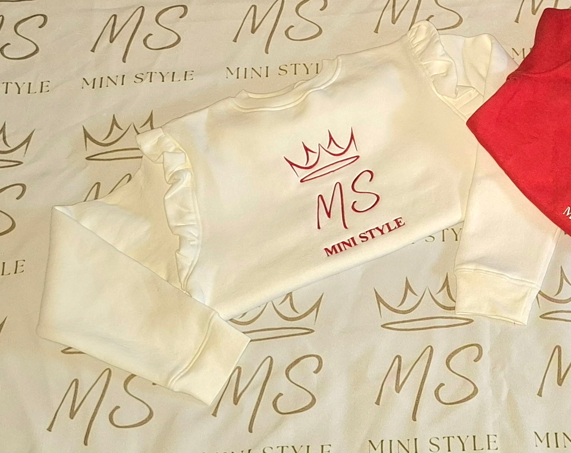 White frilly jumper with red logo perfect for a Christmas outfit.